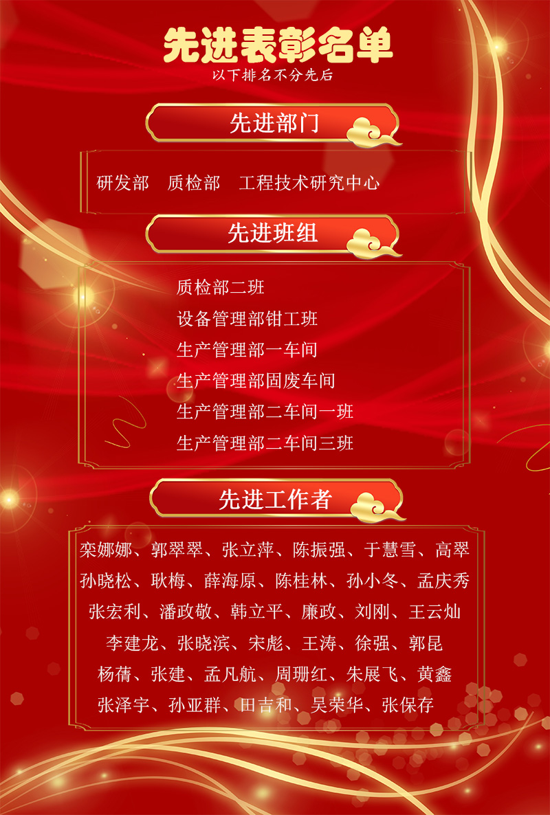 表彰先進,樹立楷模,1月24日下午,公司2021年度先進表彰儀式在研發中心會議室隆重舉行,儀式現場對先進工作者、先進班組、先進部門進行表彰嘉獎。公司董事長、總經理張新功,公司各級經營管理干部及先進工作者、先進班組及部門代表參加了儀式。