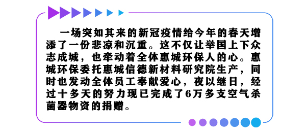 隨后,裝載五萬(wàn)支殺菌器的車輛啟動(dòng),它將承載全體惠城環(huán)保人的愛(ài)心,駛達(dá)最急需的防疫一線。